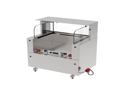 Mit flexibler Randabsaugung. Betrieb wählbar links, rechts oder beidseitig. 2 Steckdosen 230 V und 2 Steckdosen 400 V. Dichtgeschweißte Einstellnische für 2 oder 3 Multi-Line 65 Geräte. Modul fahrbar durch 4 Lenkrollen mit Feststeller. Inkl. frontseitigem Spritzschutz aus Glas, Anbau links und rechts mit Ausschnitten und GN-Schalen. Absaugung: Die entstandenen Wrasen werden 3-seitig abgesaugt und durchlaufen das patentierte ACS-Umluftsystem. In der linken und rechten Seitenwange befinden sich die Hochleistungs-Fettabscheider (100% flammdurchschlagsicher) mit 2 entnehmbaren Fettauffang schalen. Im Unterbau sind die geräuscharmen Radialgebläse platziert. Geruchsreinigung durch die patentierte Plasmatechnologie in Verbindung mit Aktivkohlefiltern. Das ACS erfüllt die Vorgaben der VDI 2052 (Raumlufttechnische Anlagen). TüV-geprüft nach DIN EN 60335. Sämtliche Bauteile sind nach den Richtlinien der DIN, VDE, GS und TüV ausgeführt.